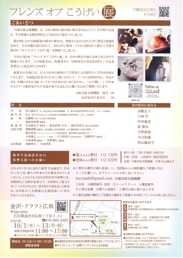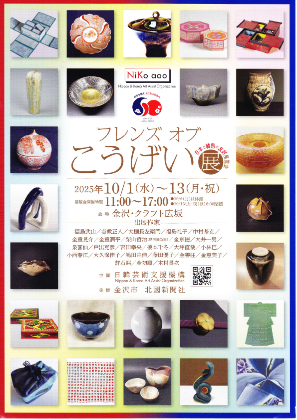 第2回 フレンズ オブ こうげい展・金沢展は、金沢市クラフト広坂ギャラリーにて、村山卓金沢市長と韓国のカンヨンヒ様のご臨席のもとに、2025年10月1日に初日を迎えました。